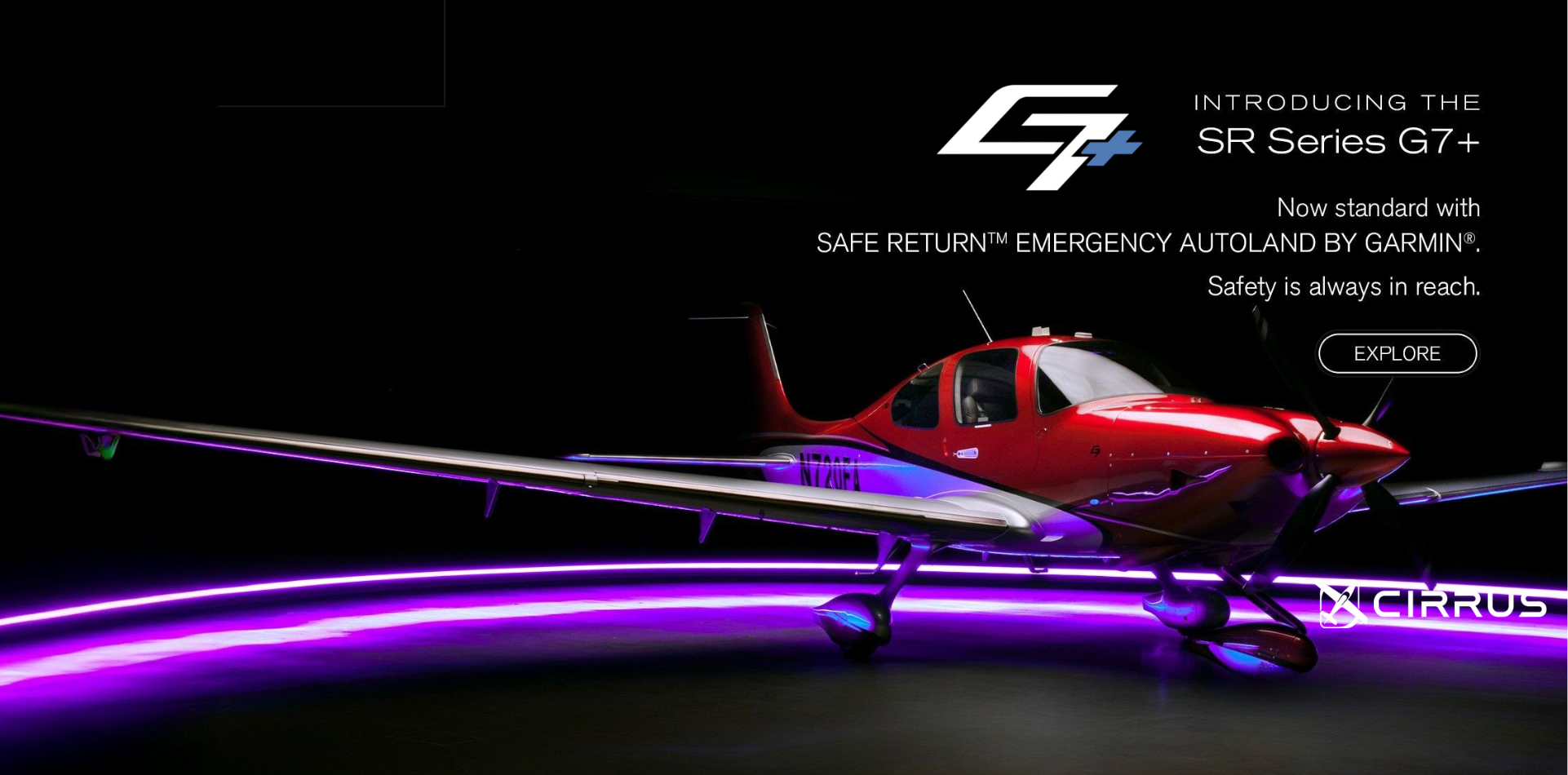 The Cirrus G7+ is the newest, most advanced model in the Cirrus SR series, distinguished by its Safe Return Emergency Autoland system, making it the first single-engine piston aircraft with this self-landing capability for passengers. Key upgrades include a completely redesigned, luxury-focused cabin with a larger 14-inch touchscreen avionics system, more legroom, improved comfort features, and advanced safety technology like Runway Occupancy Awareness (ROA). Other features enhance safety and convenience, such as automatic database updates, smart pedo heat, keyless start, and an improved climate control system.